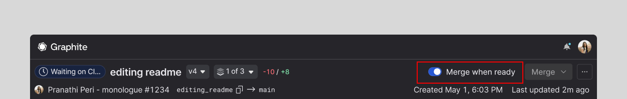 You can quickly enable merge when ready for a stack by navigating to the top-most PR in the stack and toggling on merge when ready for that PR. Graphite will show you a confirmation modal asking whether or not you want to enable merge when ready on all downstack PRs.Downstack PRs that have “merge when ready” enabled will merge whenever they individually become ready to, such as once they are approved and required CI checks have passed. They will not wait for or require any upstack PR to also be ready before merging.