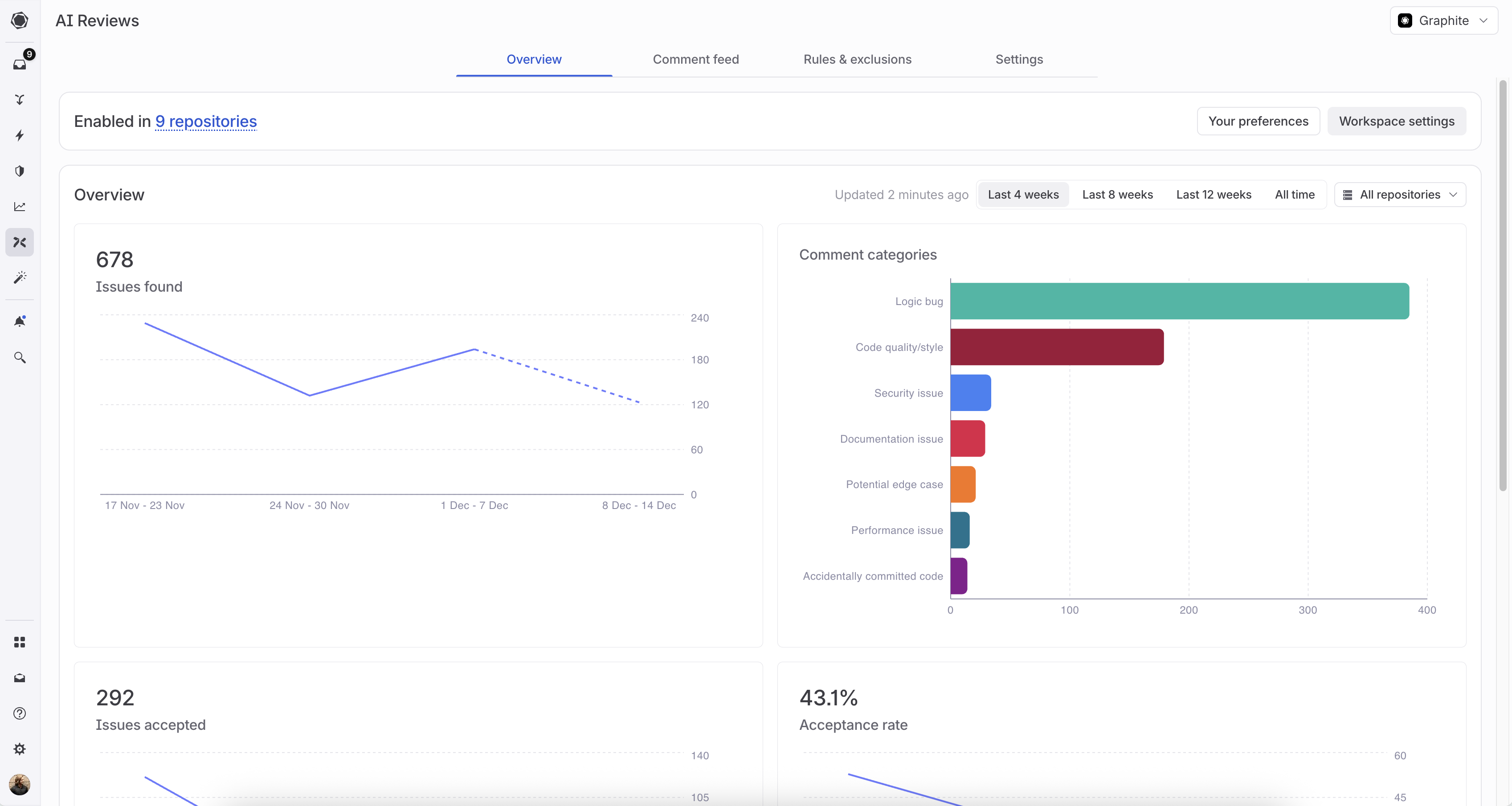The Comment feed tab lets you:- View all comments Graphite Agent has left across your repositories