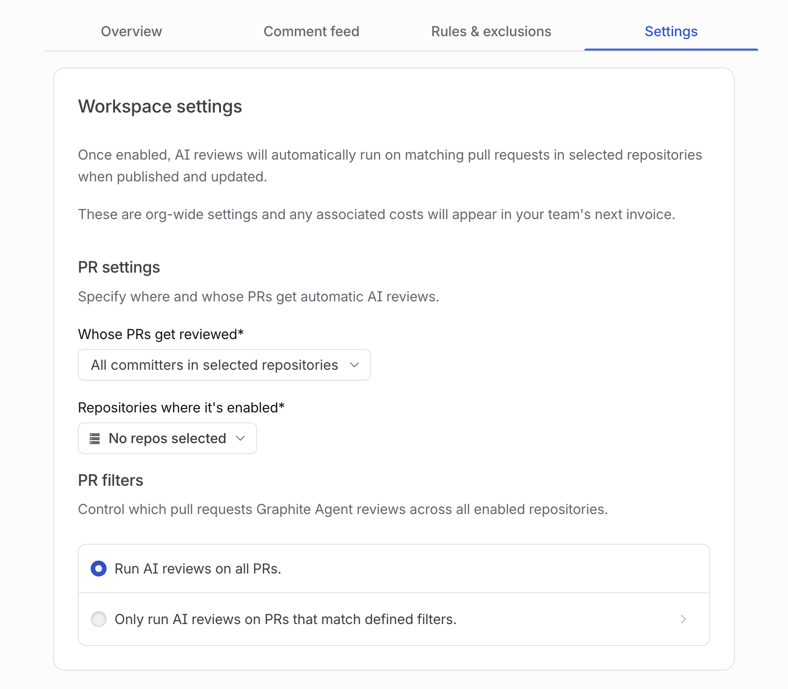 - You can choose specific repositories or enable AI reviews across your entire organization